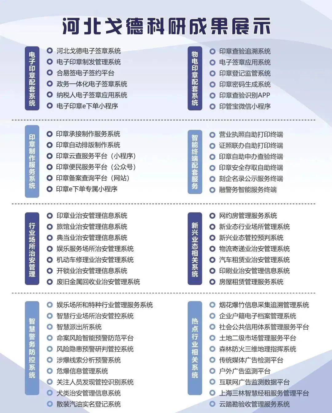 河北戈德依托雄厚的資金實(shí)力、完善的數(shù)字化技術(shù)、先進(jìn)的智能化設(shè)備、專業(yè)的研發(fā)團(tuán)隊(duì)、超前的服務(wù)理念等企業(yè)優(yōu)勢(shì),獨(dú)立研發(fā)了電子印章配套系統(tǒng)、物電印章配套系統(tǒng)、印章制作服務(wù)相關(guān)系統(tǒng)、智能終端配套服務(wù)、行業(yè)場(chǎng)所治安管理系統(tǒng)、新興業(yè)態(tài)相關(guān)系統(tǒng)、智慧警務(wù)防控系統(tǒng)、熱點(diǎn)行業(yè)相關(guān)系統(tǒng)等諸多系統(tǒng)平臺(tái),為不同行業(yè)場(chǎng)所匠心打造互聯(lián)網(wǎng)+全方位解決方案,深受政府表?yè)P(yáng)、業(yè)內(nèi)盛贊、及相關(guān)部門高度認(rèn)可與信賴。