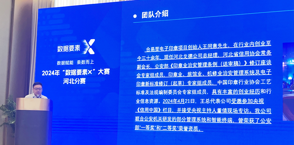 9月25日,由河北省數(shù)據(jù)和政務(wù)服務(wù)局聯(lián)合河北雄安新區(qū)管理委員會(huì)等多部門(mén)共同舉辦的2024年“數(shù)據(jù)要素X”大賽河北分賽決賽在雄安國(guó)際酒店圓滿(mǎn)落幕,河北戈德公司總經(jīng)理王同意先生攜自主研發(fā)的“合易簽”電子印章項(xiàng)目積極參賽,憑借過(guò)硬的研發(fā)技術(shù)及前沿化創(chuàng)新理念,從眾多項(xiàng)目中脫穎而出,最終斬獲本次大賽特色單項(xiàng)獎(jiǎng)——技術(shù)創(chuàng)新獎(jiǎng)。這不僅是對(duì)合易簽科研成果的褒獎(jiǎng),更是對(duì)河北戈德科研團(tuán)隊(duì)的認(rèn)可!