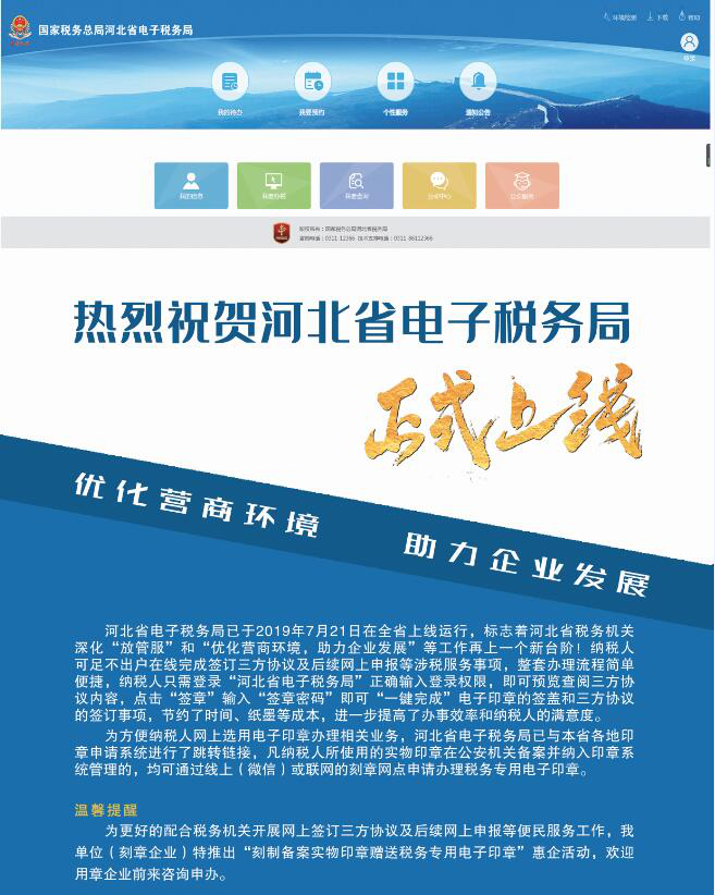 ? ? ? ?河北省電子稅務(wù)局網(wǎng)上業(yè)務(wù)辦理及電子簽章系統(tǒng)于2019年7月21日正式上線。這標(biāo)志著河北省稅務(wù)機(jī)關(guān)深化“放管服”改革和“優(yōu)化營(yíng)商環(huán)境”等工作再上一個(gè)新臺(tái)階!